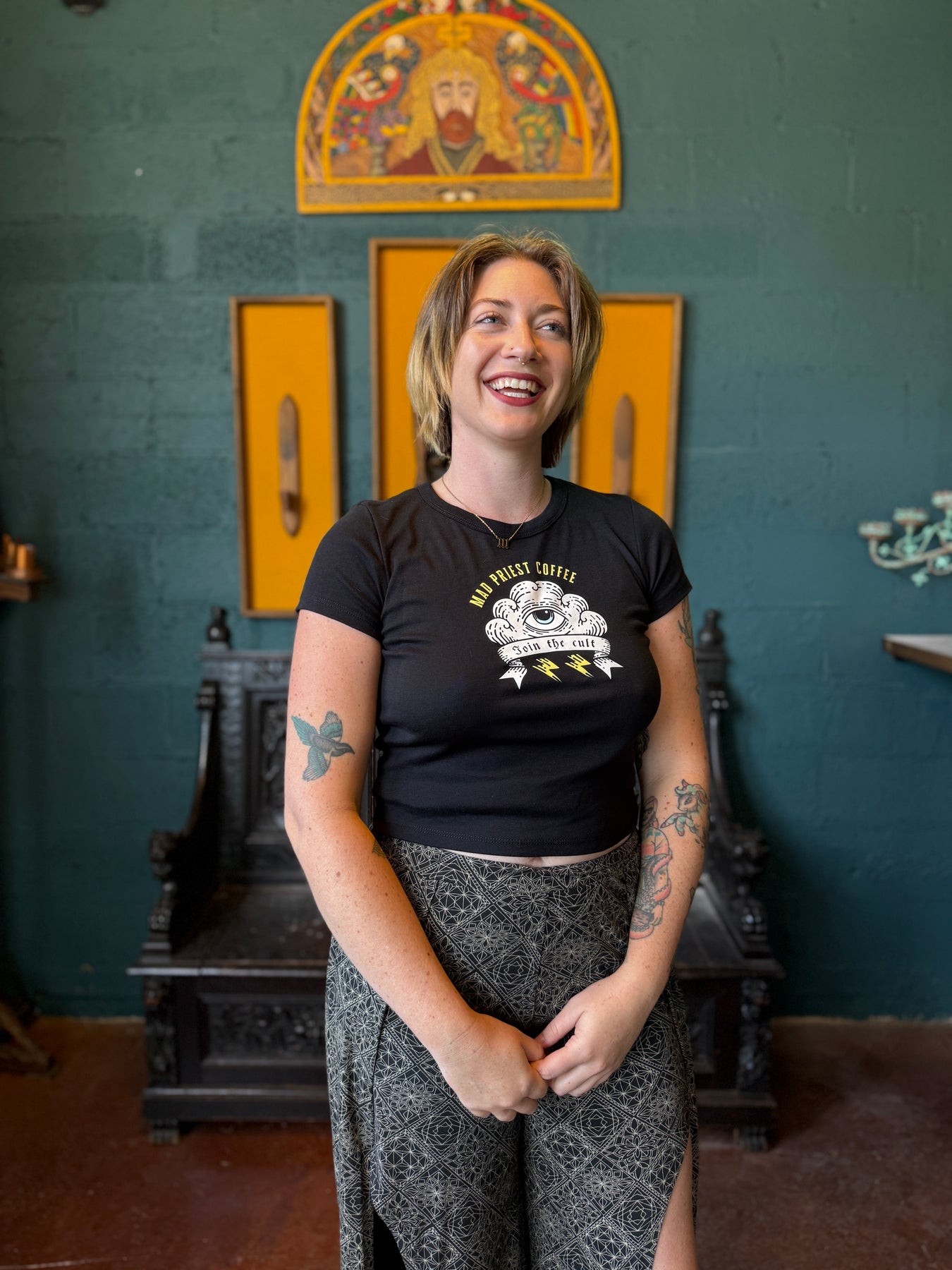 Tiny tee. Big energy. This baby crop says what we’re all thinking: Join the Cult. Perfect for sippin', sinnin', and soft-launching your spiritual awakening (or just your midriff). Don’t worry—it’s a fun cult. We have coffee.